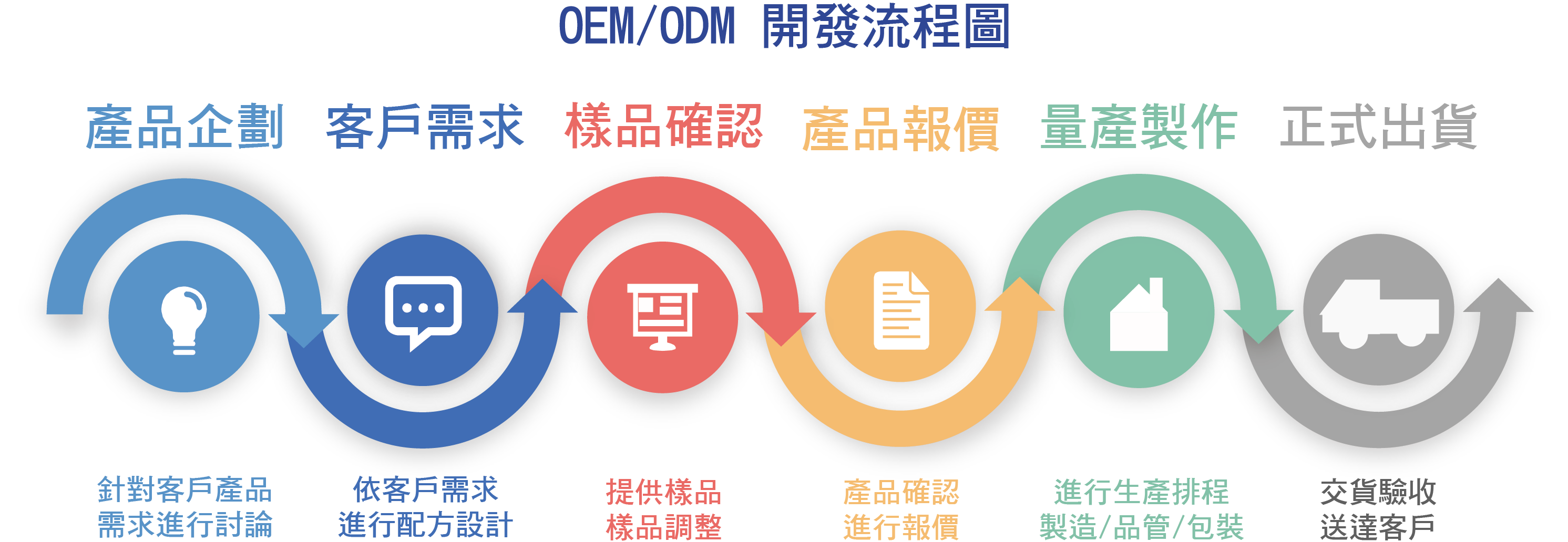 我們提供優質的整合服務,一次滿足客戶客製化、量產化的需求,依需求量身訂製的解決方案包含:專屬專案管理團隊全面了解您的需求,由國際級微生物專家-陳明造博士領軍的專業研發團隊,根據您的需求進行配方研製,從產品研發、品保、檢驗、量化生產,至產品出庫,皆經過高規格的嚴格品質控管。